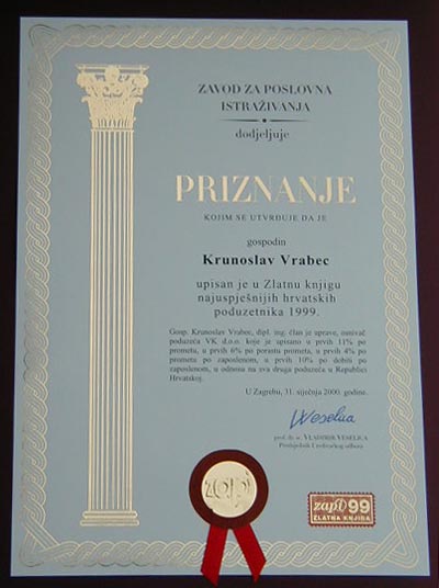 PRIZNANJE KOJIM SE UTVRĐUJE DA JE gospodin Krunoslav Vrabec, dipl. ing. član uprave, osnivač poduzeća VK d.o.o. Križevci koje je upisano u prvih 11% po prometu, u prvih 6% po porastu prometa, u prvih 4% po prometu po zaposlenom, u prvih 10% po dobiti po zaposlenom, u odnosu na sva druga poduzeća u Republici Hrvatskoj možete vidjeti desno na slici PRIZNANJA koje je